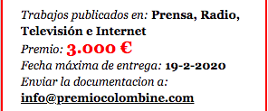 España Incentivo: 3000 euros Plazo de inscripción: 19 de febrero de 2020 El premio Colombine es organizado por la Federación de Asociaciones de Periodistas de España en honor a Carmen de Burgos, quien es considerada la primera periodista profesional de España. Está enfocado en premiar trabajos periodísticos publicados en prensa, radio, televisión o internet sin…